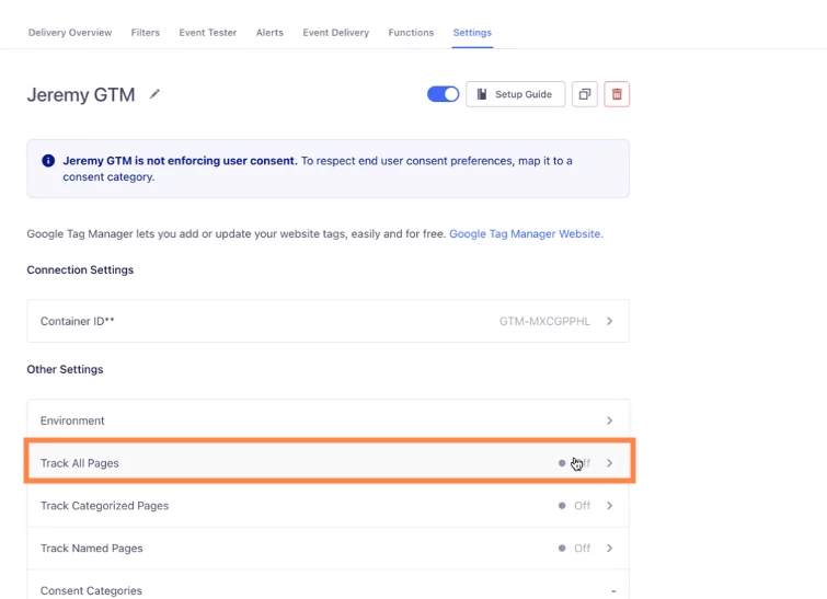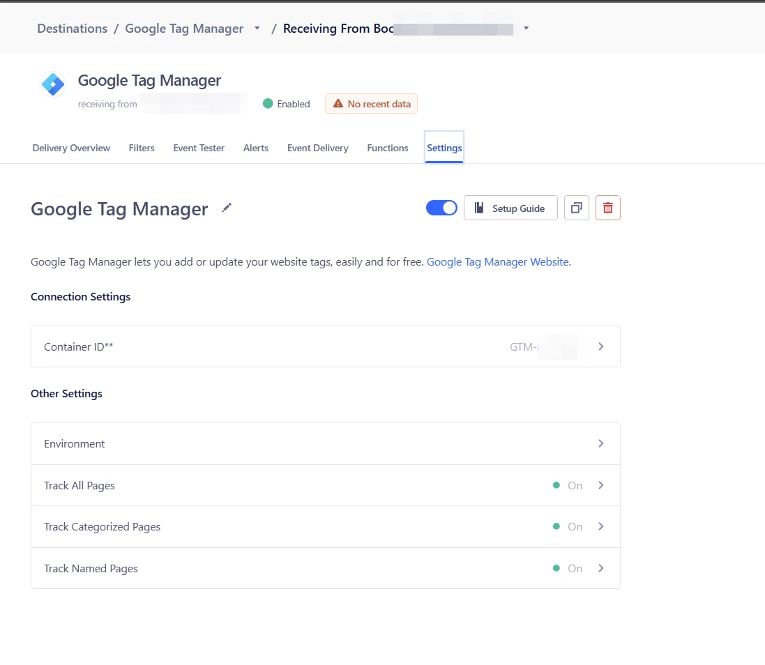 I created a destination of Google Tag Manager and connected with the source where events are coming in.