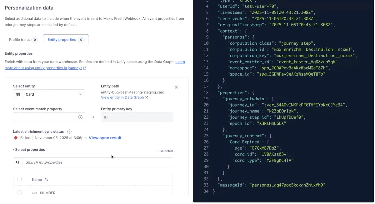Destination Sends from the new version of Journeys now support enriching outbound payloads with warehouse data, allowing you to add entirely new fields or update key data with the latest and greatest from your source of truth.